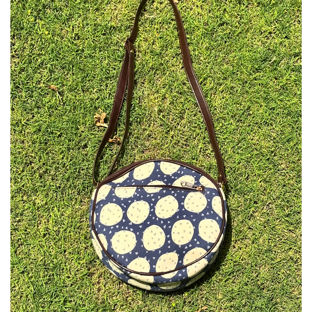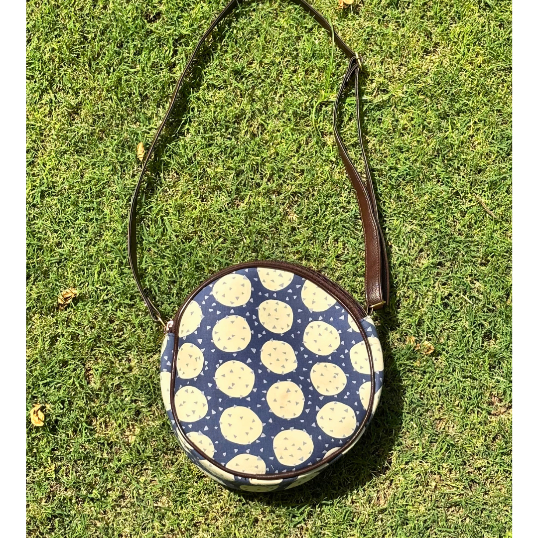 Embrace style and functionality with our Circle orbit Sling Bag. This round sling features beautiful handicraft fabric with traditional Afro prints, perfect for the fashion-conscious woman. The waterproof ragzin lining protects your belongings, while two main zippers and an adjustable strap offer convenience. The additional back pocket provides extra storage space for your essentials.