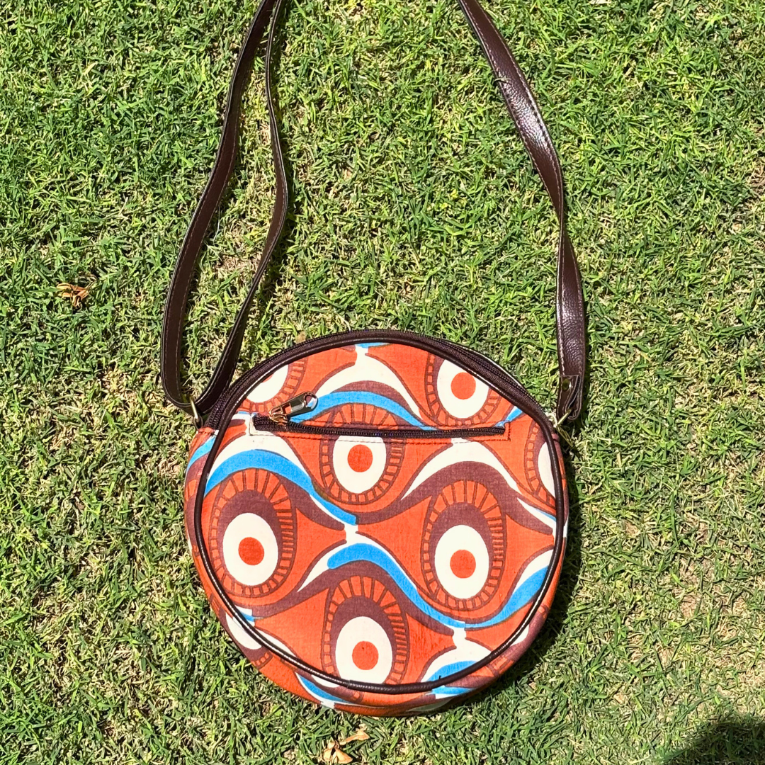 Embrace style and functionality with our Afro Brown Sling Bag. This round sling features beautiful handicraft fabric with traditional Afro prints, perfect for the fashion-conscious woman. The waterproof ragzin lining protects your belongings, while two main zippers and an adjustable strap offer convenience. The additional back pocket provides extra storage space for your essentials.