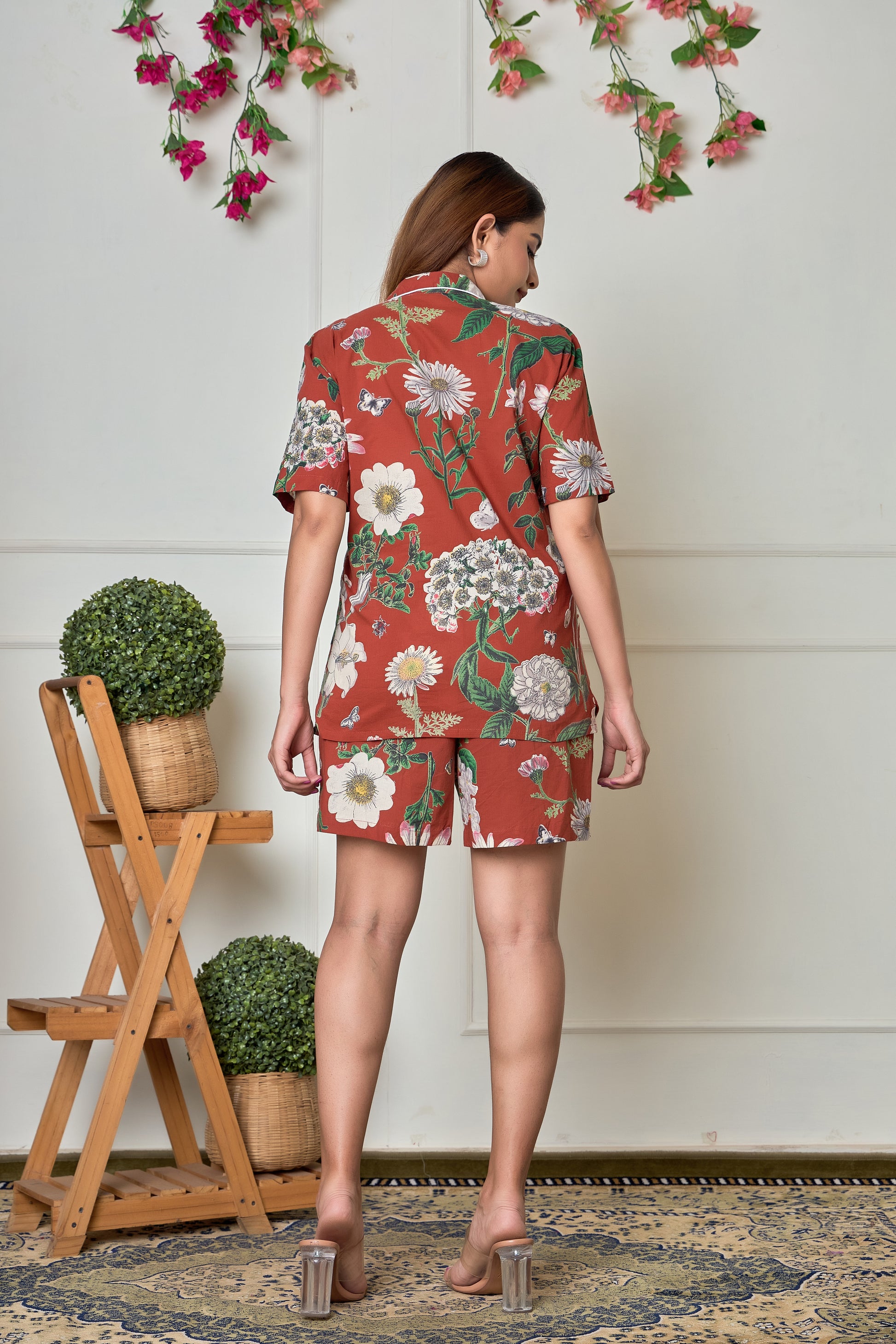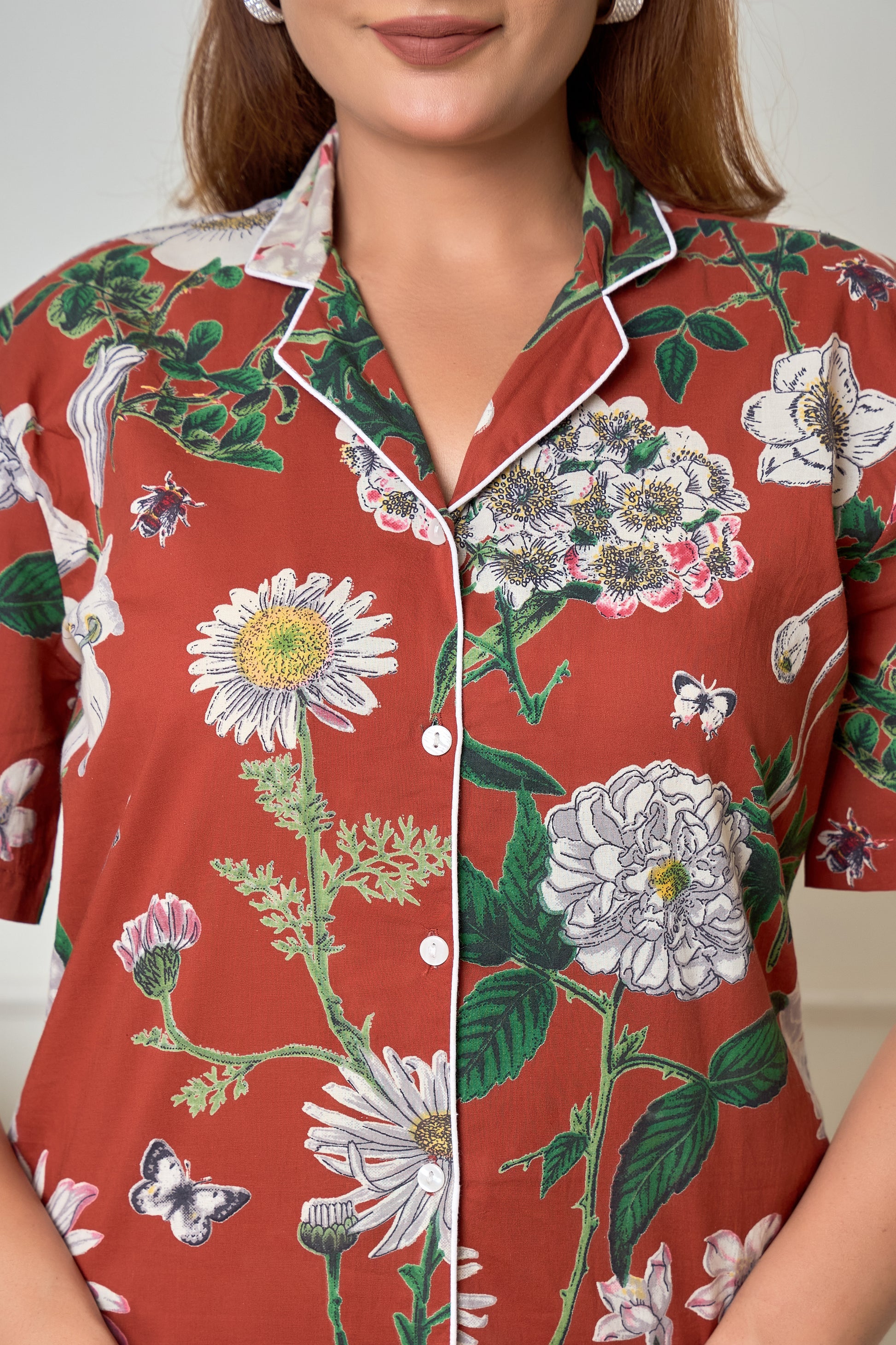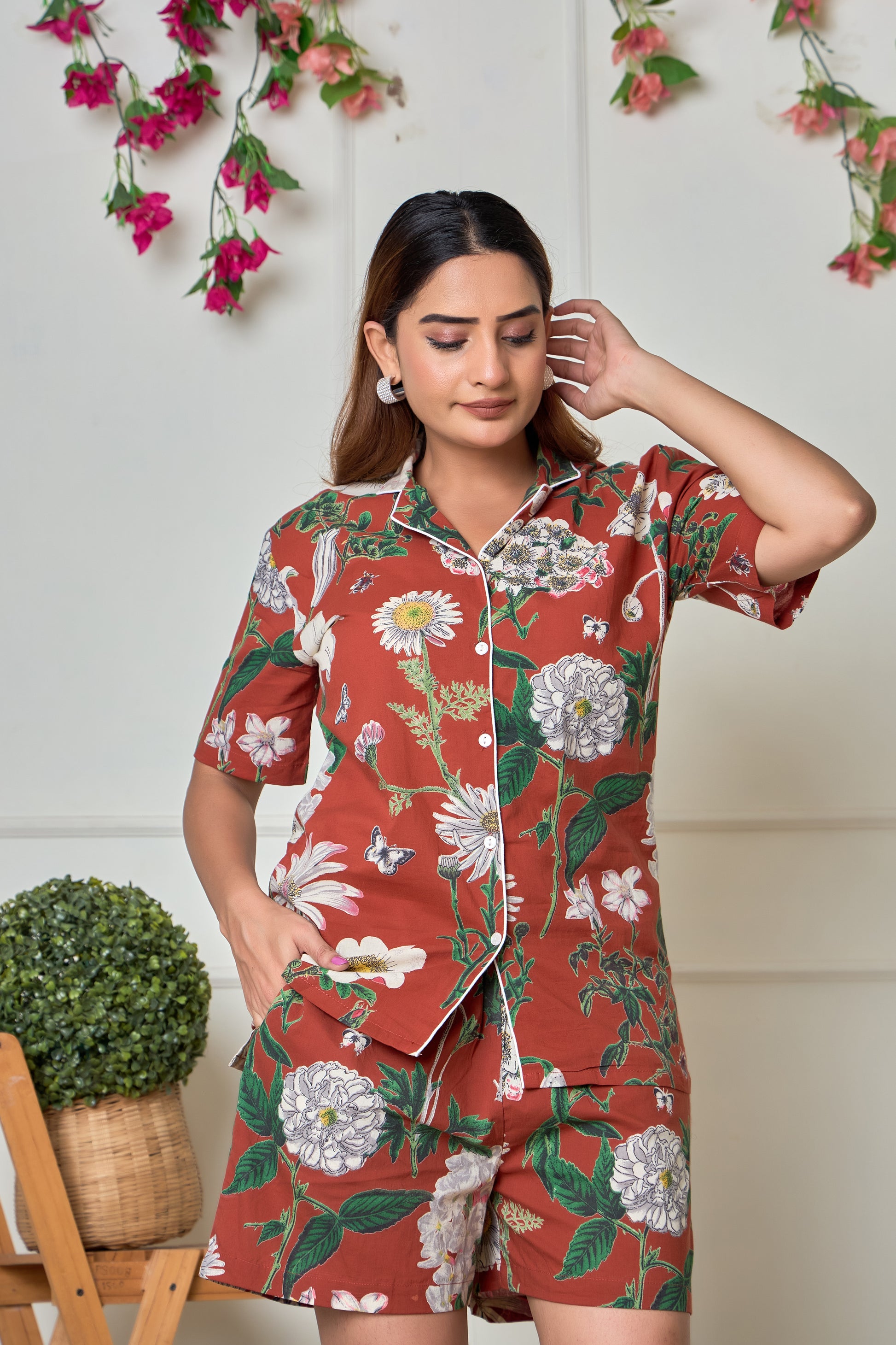 Unleash your style with our Brown Big Flower Cotton short sleeve shorts Night suit. Featuring a Floral print collection, this set includes a button down shirt with collars and elastic waist pants with pockets - perfect for slaying your home fashion game. Comfort and cuteness, all in one!