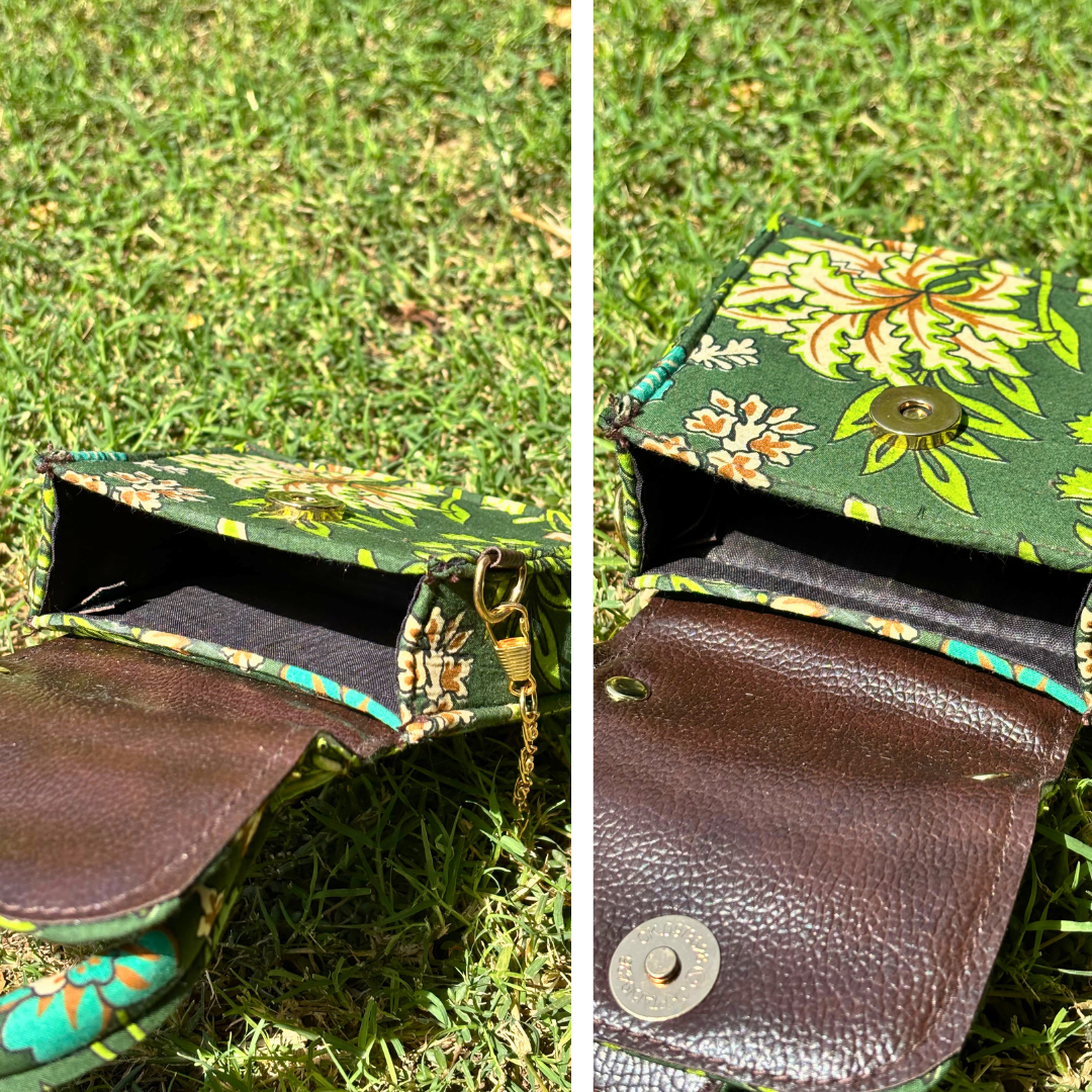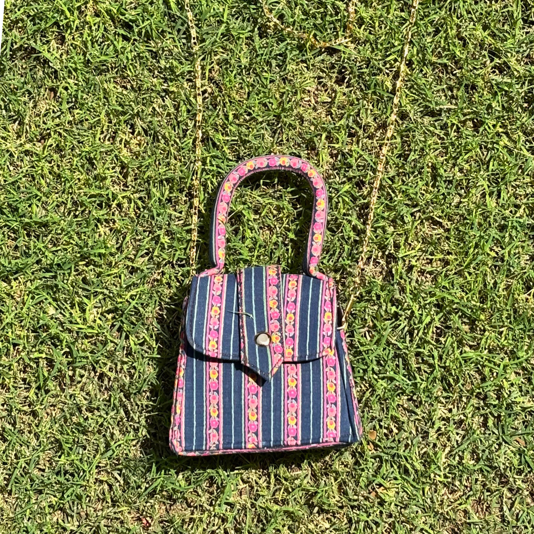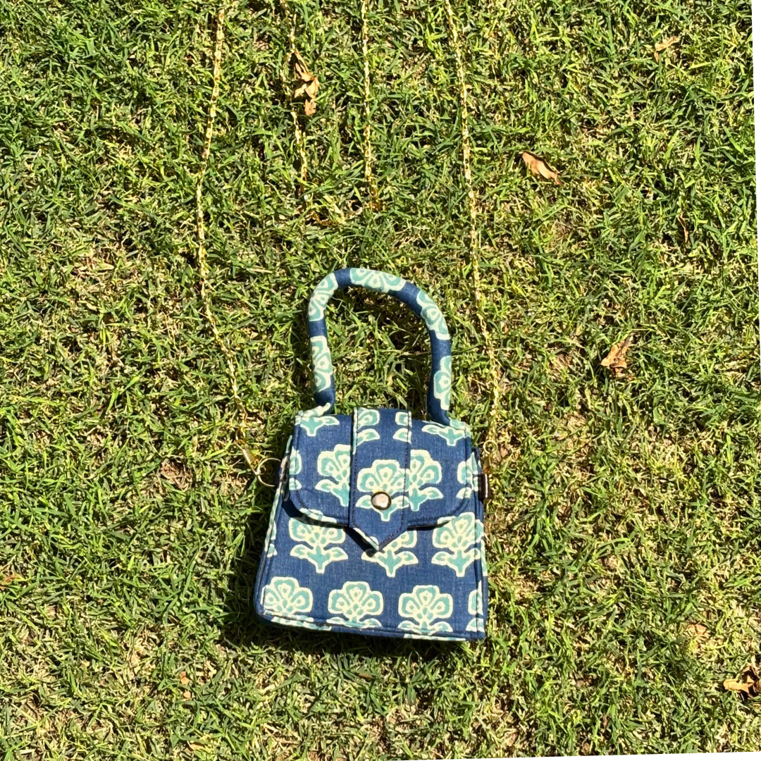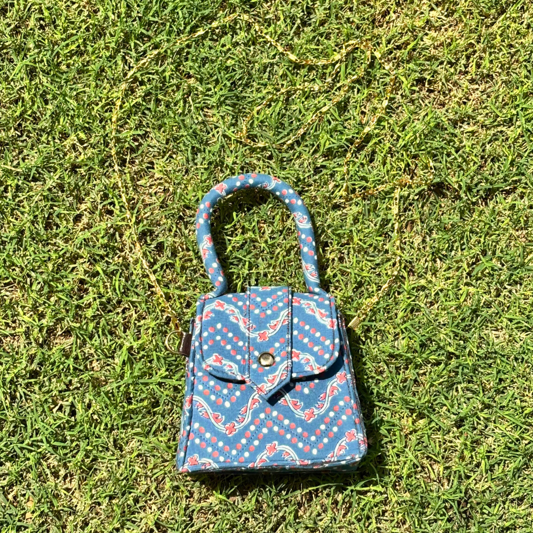 Embrace style and functionality with our Blue & Mix Mini Sling Bag. This sling features beautiful handicraft fabric with traditional & modern prints, perfect for the fashion-conscious woman. The waterproof ragzin / lining protects your belongings, and an gold metal strap offer convenience.