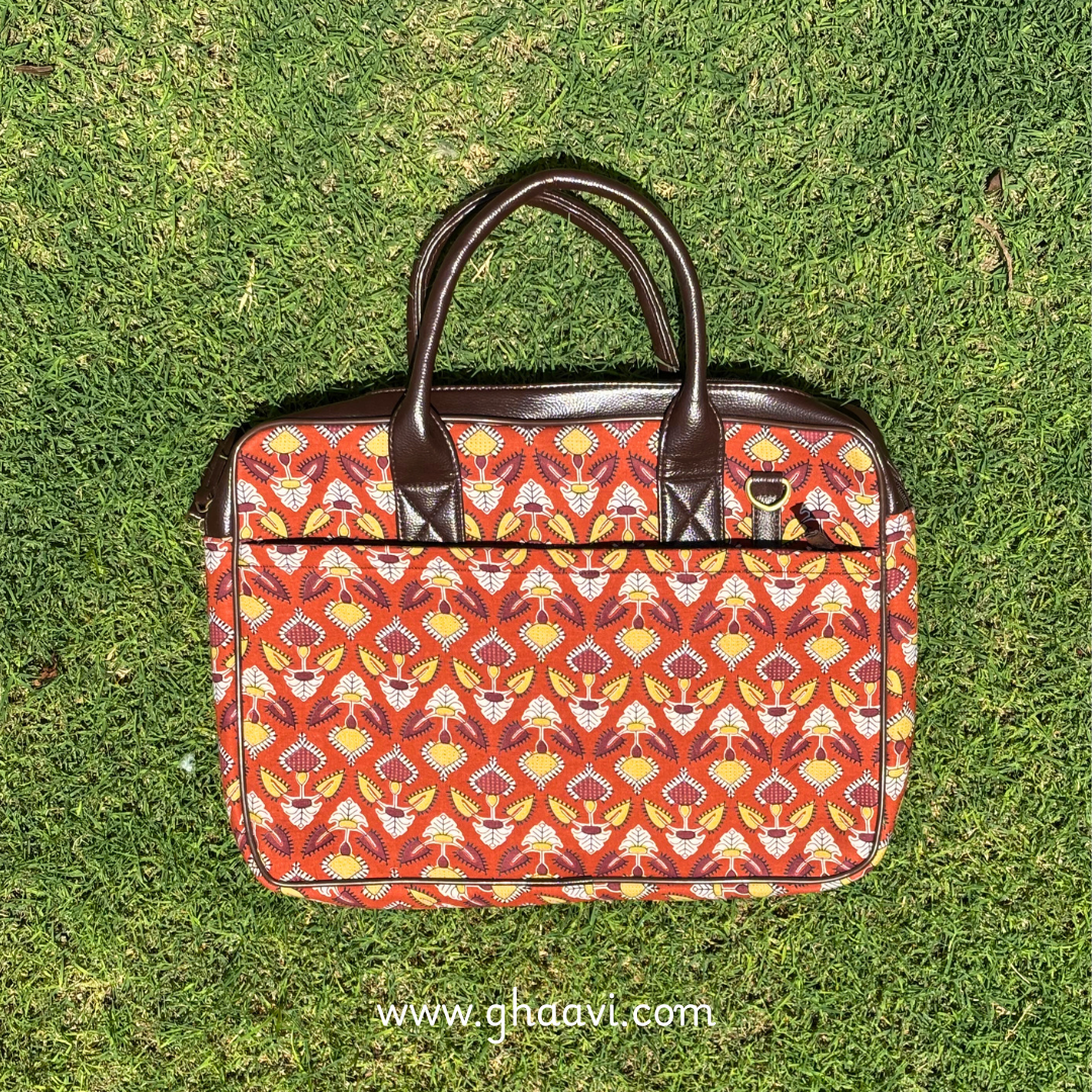 Carry all with ease in our Indian-inspired Orange batik look Laptop Bag. This stylish bag features a zip closure, adjustable strap, and double handles for easy access. The padded laptop compartment and organizational slots make it functional, while the elegant print adds a touch of culture. Elevate your style!