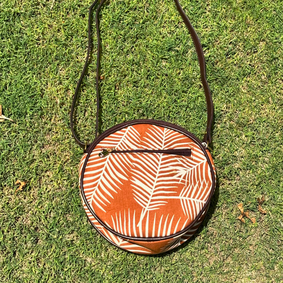 Embrace style and functionality with our Brown leaves Sling Bag. This round sling features beautiful handicraft fabric with traditional prints, perfect for the fashion-conscious woman. The waterproof ragzin lining protects your belongings, while two main zippers and an adjustable strap offer convenience. The additional back pocket provides extra storage space for your essentials.