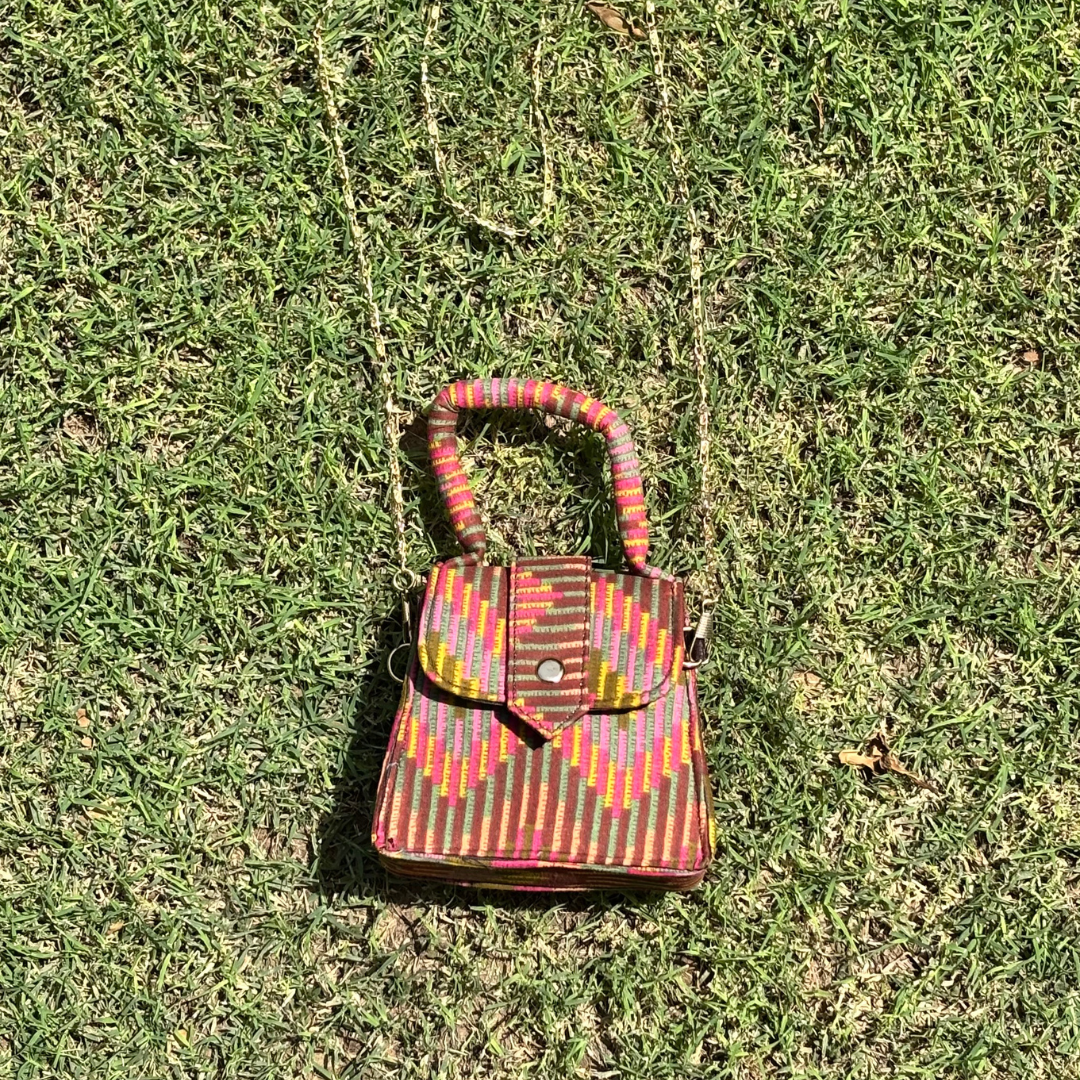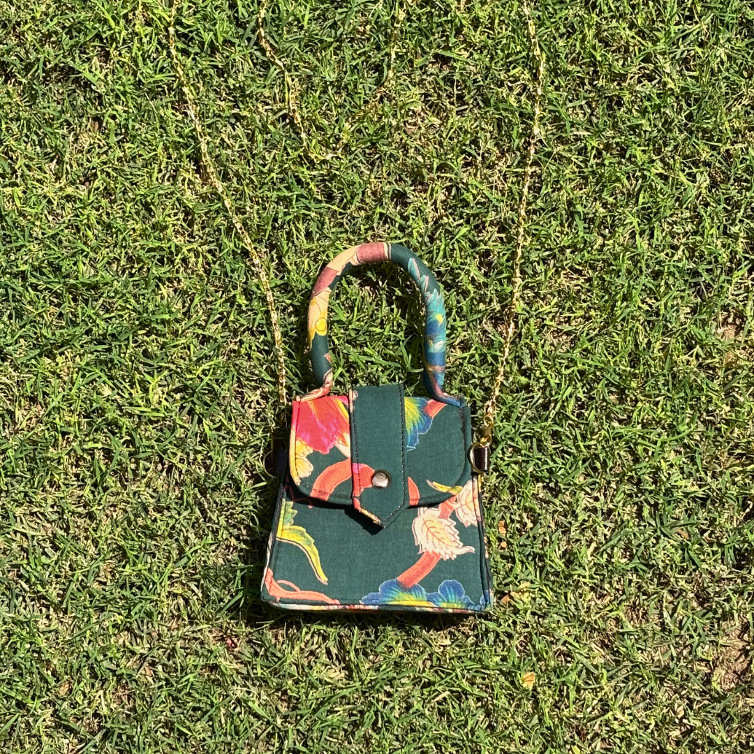 Embrace style and functionality with our Green & Mix Mini Sling Bag. This sling features beautiful handicraft fabric with traditional & modern prints, perfect for the fashion-conscious woman. The waterproof ragzin / lining protects your belongings, and an gold metal strap offer convenience.