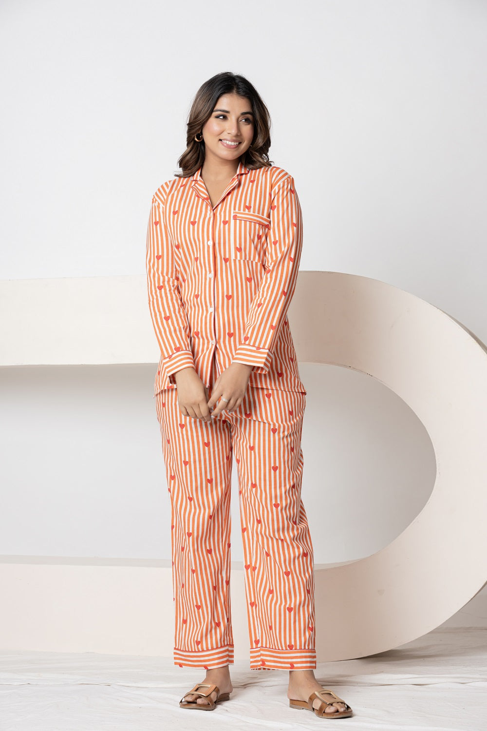 Crafted from premium cotton, this striped night suit combines breathable comfort with charming heart print details. The relaxed fit features a button-front closure for easy dressing, paired with matching drawstring pants equipped with functional pockets. Lightweight and airy, it's an ideal choice for warm nights, offering the perfect balance of style and practicality for year-round wear.